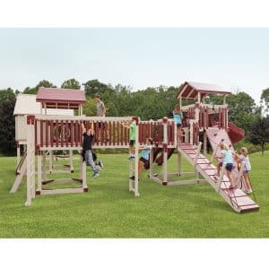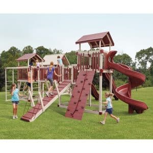Wooden swing sets for children are a thing of the past. Our outdoor playsets and swings sets for sale are maintenance-free and made from the most durable materials available. Since all wood is cased in vinyl sleeves, there is no splintering and no need for upkeep with a backyard swing set from Adventure World Play Sets. Outdoor playsets should be a place for playful fun, so take the worry out with a custom-made set from Adventure World Play Sets.